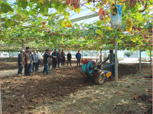最后,参训人员来到东三乡田间,观摩葡萄园土壤修复改良。通过撒入菇渣(绿色低碳),将菇渣与土壤充分结合,起到改善土壤结构,达到适气性强,保持土壤湿度的目的。