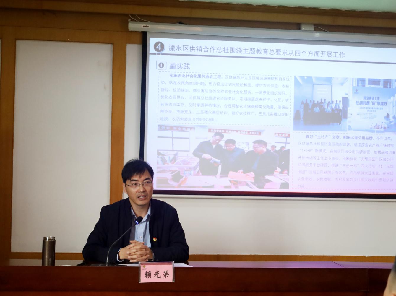 会上,赖光荣同志以《扎实抓好主题教育,为奋进新征程凝心聚力把学习贯彻习近平新时代中国特色社会主义思想不断引向深入》为题,从学习贯彻习近平新时代中国特色社会主义思想主题教育如何开展、党员干部必须不断提升三种能力、学习领会习近平总书记中央纪委六次全会“六个必须”重要讲话精神和溧水区供销合作总社围绕主题教育总要求从四个方面开展工作等方面,为全体党员上了一堂生动的党课。