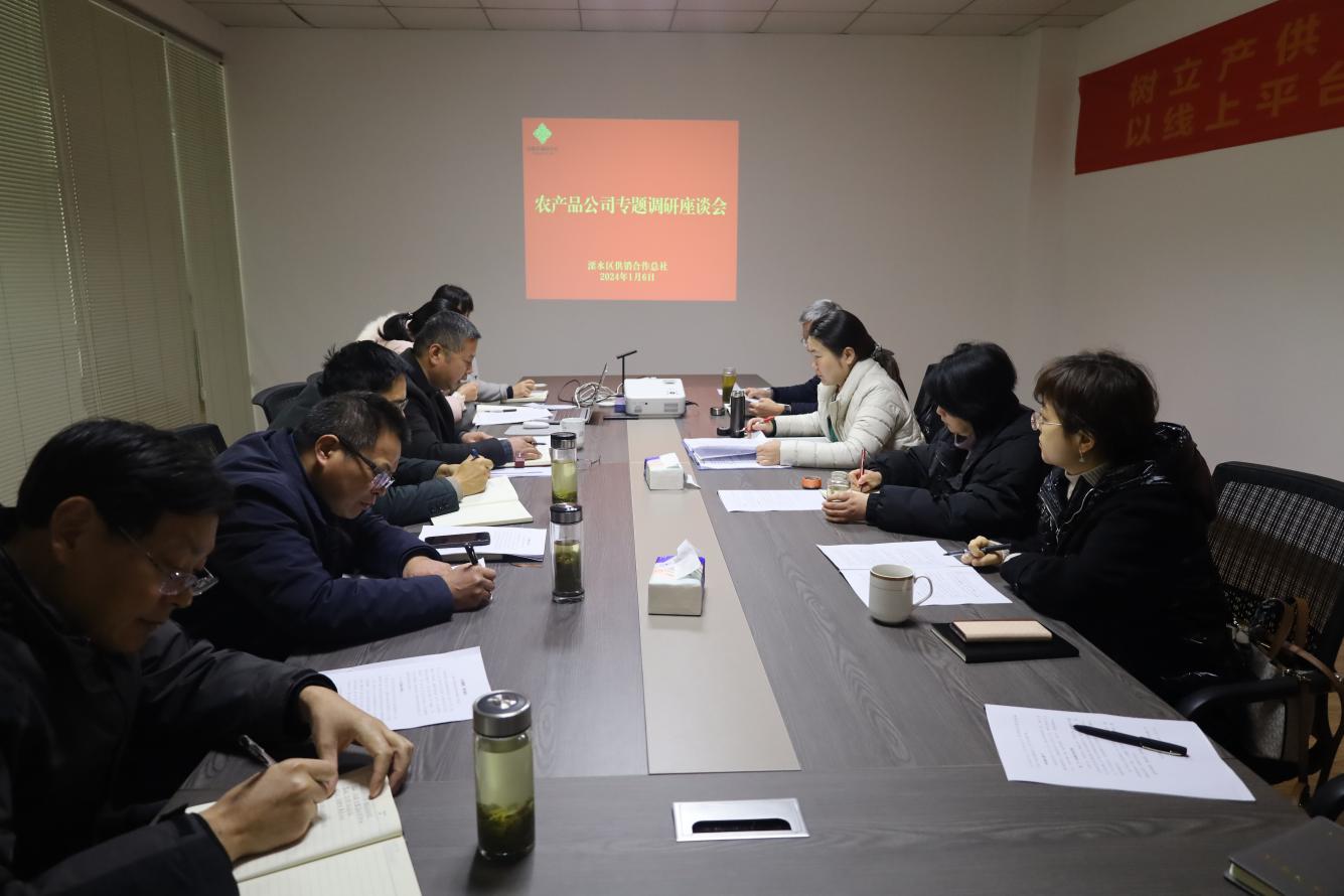 在随后召开的座谈会上,调研组认真听取了农产品公司相关负责人对近年来开展网点建设、发展电商、拓宽渠道等方面工作的汇报。与会领导纷纷对农产品公司如何做好流通主责主业,保障公司高质量运营发展建言献策。张群对农产品公司在线上线下保供稳价工作表示充分肯定,强调要坚持稳中求进总基调,按照“为农服务、加强管理、专攻主业、创新转型”的发展思路,优化经营方向、经营结构、经营模式,努力为城乡居民提供更多的贴心服务,充分展现供销新形象、传递新理念,彰显新时代供销合作社为农服务新担当。