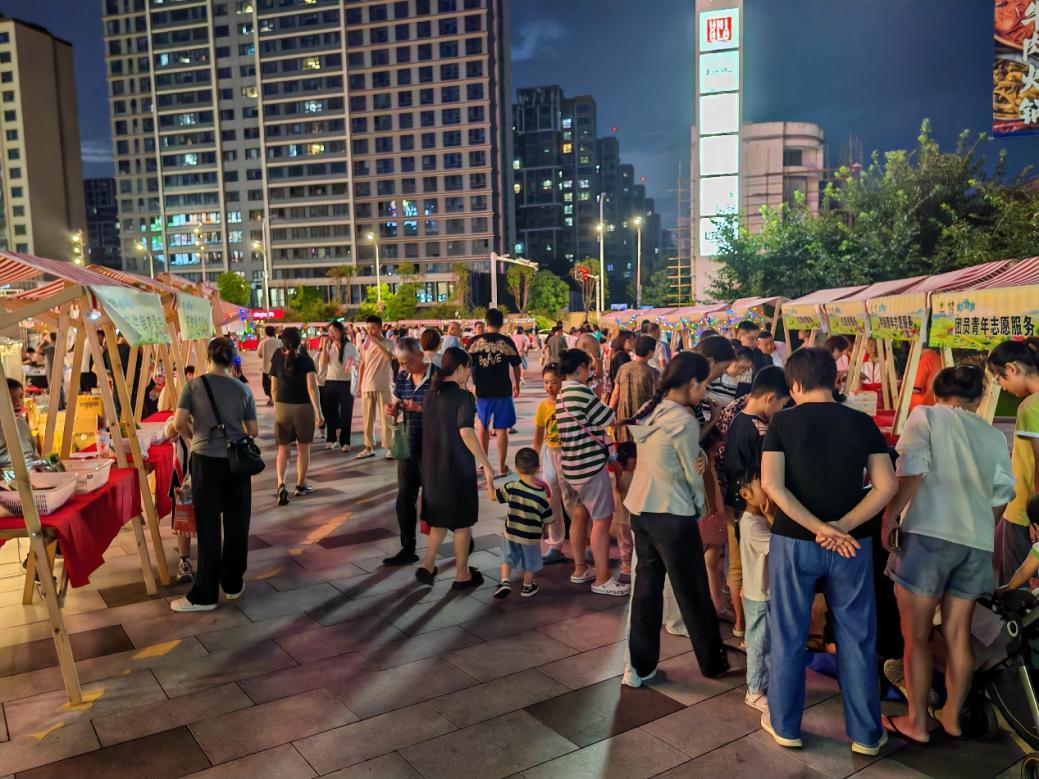 夜幕降临,夜市上灯光璀璨,近50个各地优质特色农产品的花车展位整齐排列,琳琅满目的农产品让人目不暇接,有鲜嫩多汁的地产水果、新鲜健康的本地有机蔬菜及来自新疆、湖南张家界、江苏淮阴等对口合作地区的特色农产品。这些农产品品质上乘、味道地道、价格实惠,受到了市民们的一致欢迎。伴随着此起彼伏的叫卖、招呼声,市民们穿梭在展位之间,选购心仪的产品、品尝地道的特色美食,活动现场热闹非凡。本次活动还汇聚了手工艺品等多类潮玩产品,深受消费者的欢迎。“刚从商场出来,发现这里有农产品集市,特地来看看,这里很多东西跟超市里不一样,买到了自己心心念念好久的陆郎茶干、活珠子,很满意的一次购物。”附近市民沙女士表示。