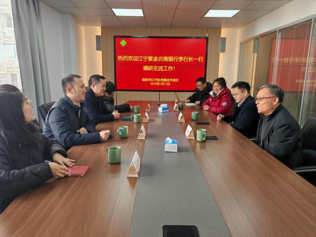 近日,紫金农商银行江宁支行李好浩行长一行到访江宁区供销合作总社,与区总社党委书记、理事会主任孙军围绕搭建助农资金融资渠道、探索“社银”合作新模式等议题展开深入交流。区总社副处级干部毕大庆、相关科室及横丹绿能农产品专业合作社负责人张静等共同参加。