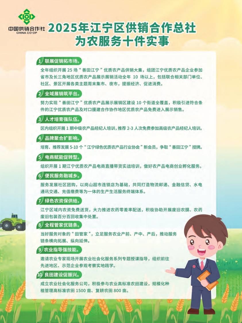 根据为农、惠农服务“双十条”措施方案,江宁区供销合作总社十件为农服务实事包括增加优质农产品展销活动、开展农产品经纪人及电商带货培训、发展“江宁绿色优质农产品行业协会”新会员、扩大社区团购便民服务范围、开展绿色农资免费配送、农业指导、参与高标准农田建设等。紫金农商银行十条惠农服务举措包括面向农业企业推出定制化金融产品、打造产业链金融服务、设立绿色通道、配备管家服务、协助申请相关政策支持、开展金融知识培训、开通手机银行助农专区、推出农业保险产品等。这些措施旨在利用供销网络畅通农产品产销对接,通过金融活水精准“滴灌”农业产业,切实解决农业农村发展中的销售难、融资难问题。