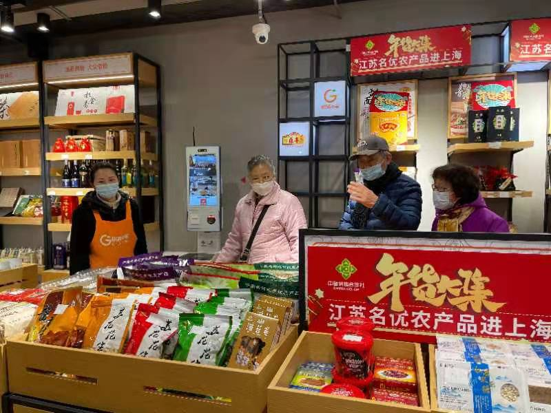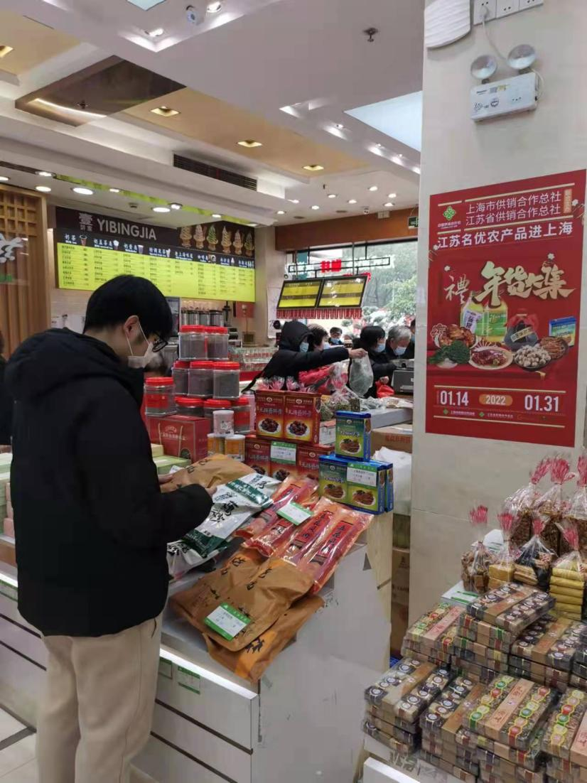 为推广江苏名优农产品,丰富上海节日市场供应,江苏省供销合作总社与上海市供销合作总社于 2022 年 1 月 14 日-31 日在上海联合举办“2022供销年货大集暨江苏名优农产品进上海展销会”活动。南京市供销集团积极响应,组织推荐了“长江南北货”旗下的香肠、香肚、刀板香、炒米糖等14种卤味和干货,其中,五花风肉刀板香入选上海三阳南货南京旗舰路店。