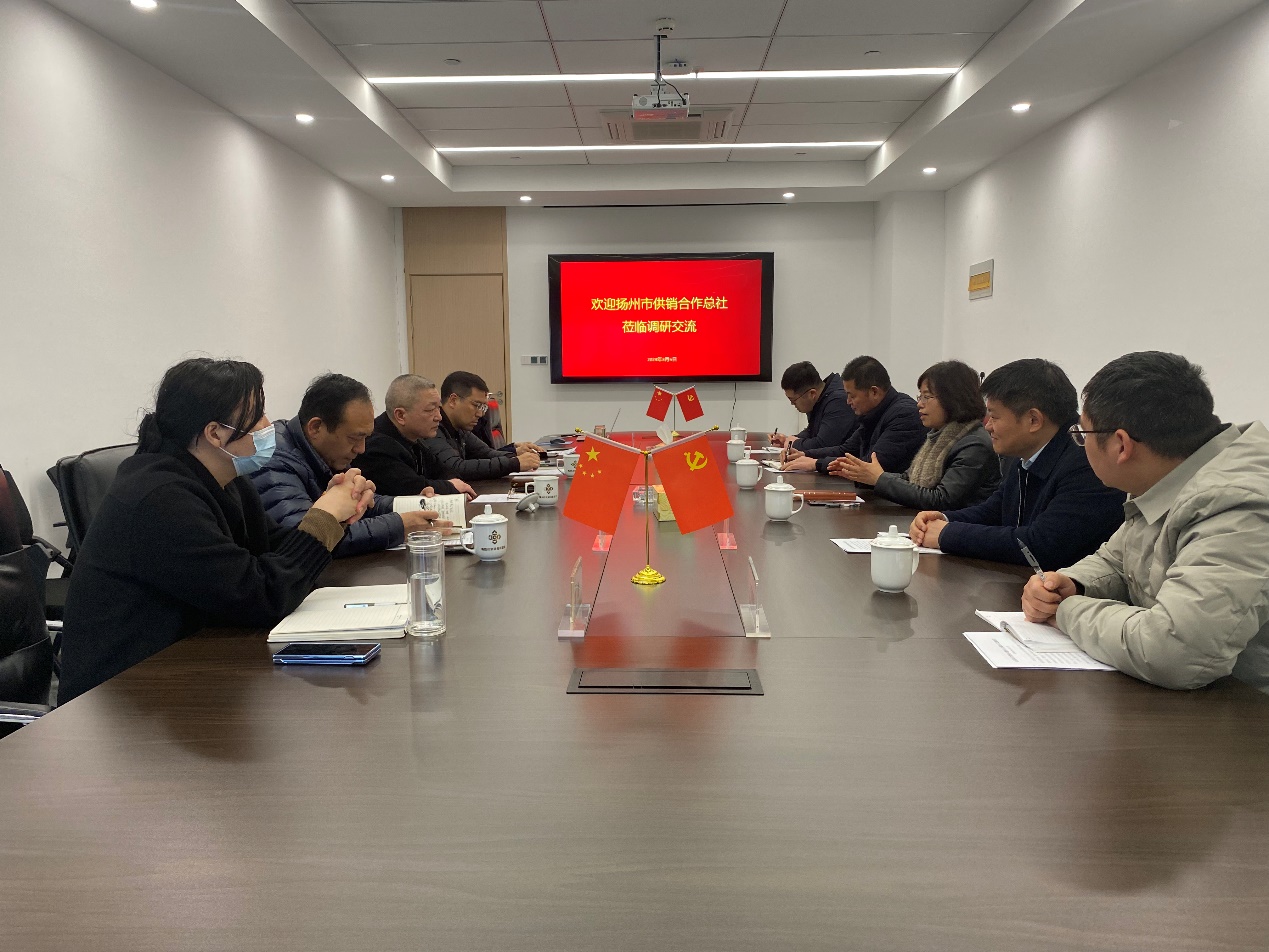 3月5日,扬州市供销合作总社党委书记、理事会主任乔国银一行5人到南京市社考察调研。市供销合作总社党委书记、理事会主任陈恒斌,党委委员、理事会副主任梁超,企业管理处和南京市供销集团主要负责同志等陪同考察。