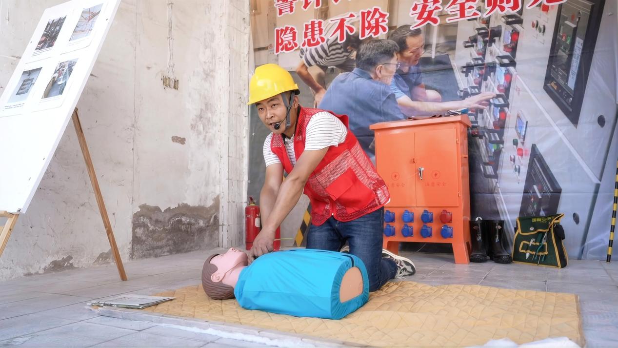 本次演练以“人人讲安全 个个会应急——畅通生命通道”为主题,针对租赁户所在“九小场所”、多业态混合场所、人员密集场所可能发生的触电、火情等突发事件进行应急处置。演练共有触电专项演练、厨房火灾现场处置和灭火器使用实际操作三个科目。触电专项演练以配电房人员触电为背景,参演人员从断电隔离、检查伤情、呼叫救援、心肺复苏等方面进行应急处置并详细讲解了注意事项。厨房火灾现场处置以租赁商户厨房作业油锅起火产生浓烟为背景,参演人员从断电关阀、报警求援、灭火扑救、烟雾逃生等方面进行了规范处置。在消防灭火演练环节,现场模拟三处起火点,参演人员分成多组,在专业人员指导下,使用干粉灭火器,按照“提、拔、瞄、压”的步骤,轮流进行灭火实操,让大家亲身体验消防灭火全过程。
